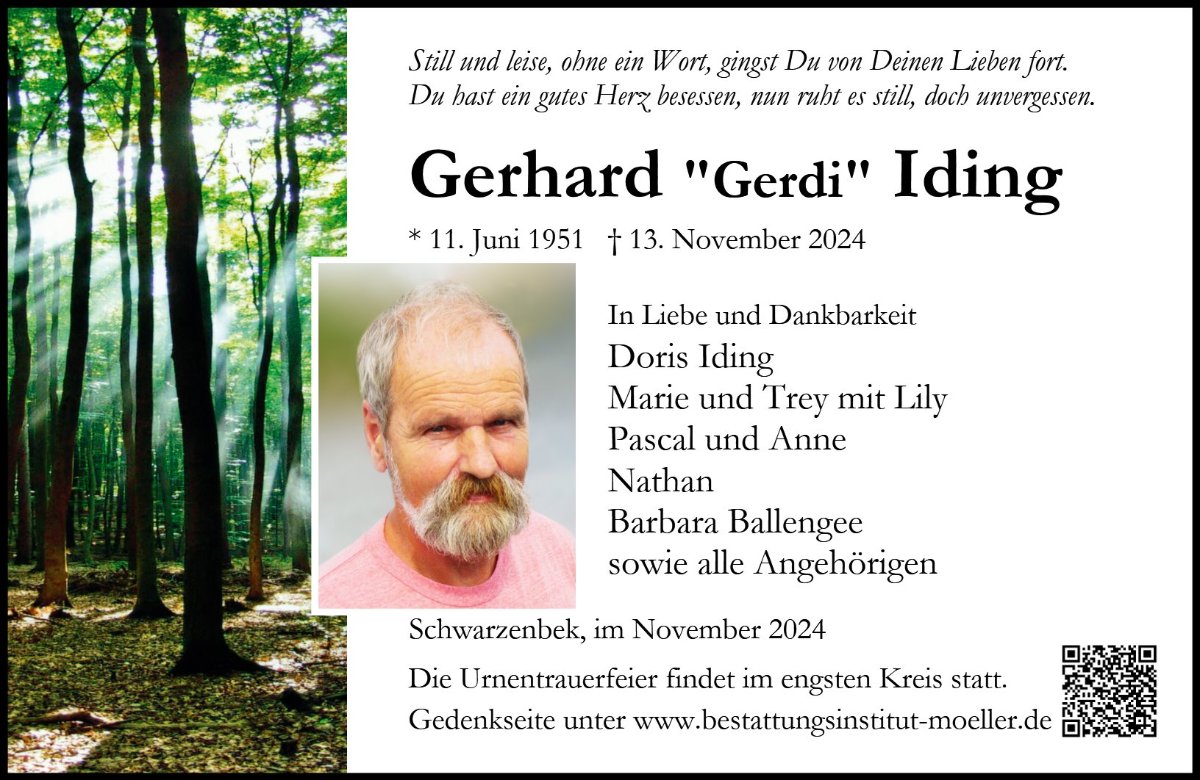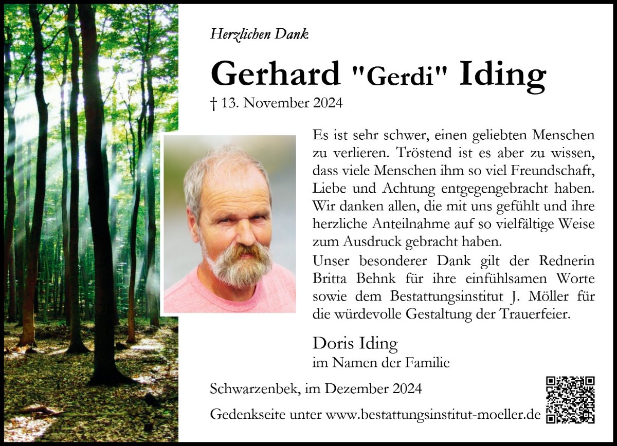 Gerd Iding war wohl jedem Schwarzenbeker - und auch darüber hinaus - ein bekanntes Gesicht. Ob nun auf diversen Sradtveranstaltungen - manchmal zusammen mit Vierbeinern, als Nikolaus an vielen Stellen, auf seinem "Idefix"... Ich sehe ihn in so vielen Momenten vor mir und erinnere mich gern an manch kurzes Gespräch und das Leuchten, welches er vielen vor allem kleinen Schwarzenbeker*innen ins Gesicht gezaubert hat. Auch im Namen des Stadtjugendringes spreche ich den Angehörigen und Freunden tiefes Mitgefühl aus und wünsche Ihnen Trost und Kraft. In Gedanken wird er weiter bei uns sein!